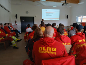 Anschließend ging es nach drinnen in den großen Seminarraum, der von den anwesenden Mitgliedern sehr gut gefüllt war. Der erste Vorsitzende Robert Klingel konnte unter anderem die beiden Bürgermeister Christian Fürst von Schäftlarn und Klaus Heilinglechner von Wolfratshausen begrüßen. Robert Klingel und seine Vorstandschaft konnten wieder auf ein erfolgreiches Jahr zurückblicken. Die Anzahl der Mitglieder steigt seit mehr als 15 Jahren stetig, so auch in diesem Jahr. Nächstes Ziel sind 500 Mitglieder. In allen Teilberichten wurde die sehr gute Zusammenarbeit mit anderen DLRG Ortsverbänden und auch mit anderen Hilfsorganisationen betont. Überall herrscht Mangel an ehrenamtlichem Personal, zusammen wird es aber immer geschafft eine schlagkräftige Truppe aufzustellen. Das gilt aber nicht nur für die Einsätze, sondern auch für die Ausbildung. Basti Hafner als Leiter Einsatz konnte aktuell auf eine gemeinsame Sanitätsausbildung mit den Nachbargliederungen der DLRG Geretsried und der DLRG Pöcking-Starnberg verweisen. Im Ausbildungsbereich freut man sich besonders auf das neue Lehrschwimmbecken in Wolfratshausen im Rahmen der Erweiterung der Grund- und Mittelschule mit dem sich die Stadt Wolfratshausen gegen den allgemeinen Trend stellt, dass landesweit immer mehr Schwimmbäder geschlossen werden. Der Schulleiter der Grund- und Mittelschule, Frank Schwesig, besuchte auch gerne die Versammlung der DLRG, die seine Einrichtung bei der Organisation des Schwimmunterrichts unterstützt.